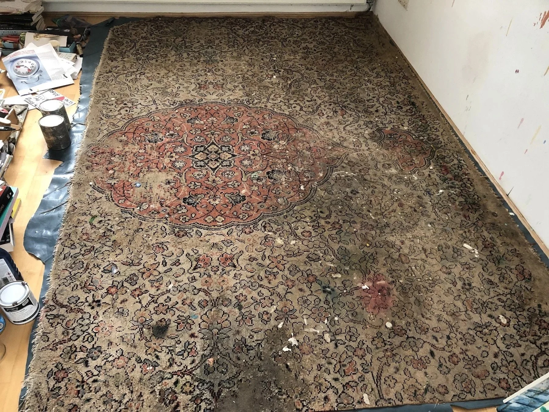 SMTS: Well, I have been in this studio since around 1999. First, it was empty and now it has become a lot fuller… I blame collectors and museums! I face one wall where I paint, and eventually the finished works move to the wall behind me. My studio in London is where I also live. It is open plan, so the studio becomes a live/eat/writing space and kitchen. The result is I can look at my work blurry-eyed every morning, while trying to wake up. At any point in the day, no matter what I am doing, I can take surreptitious glances at the paintings that are growing. Also, my studio floor is a carpet that I found in a skip decades ago. It has been in my last four or five studios.